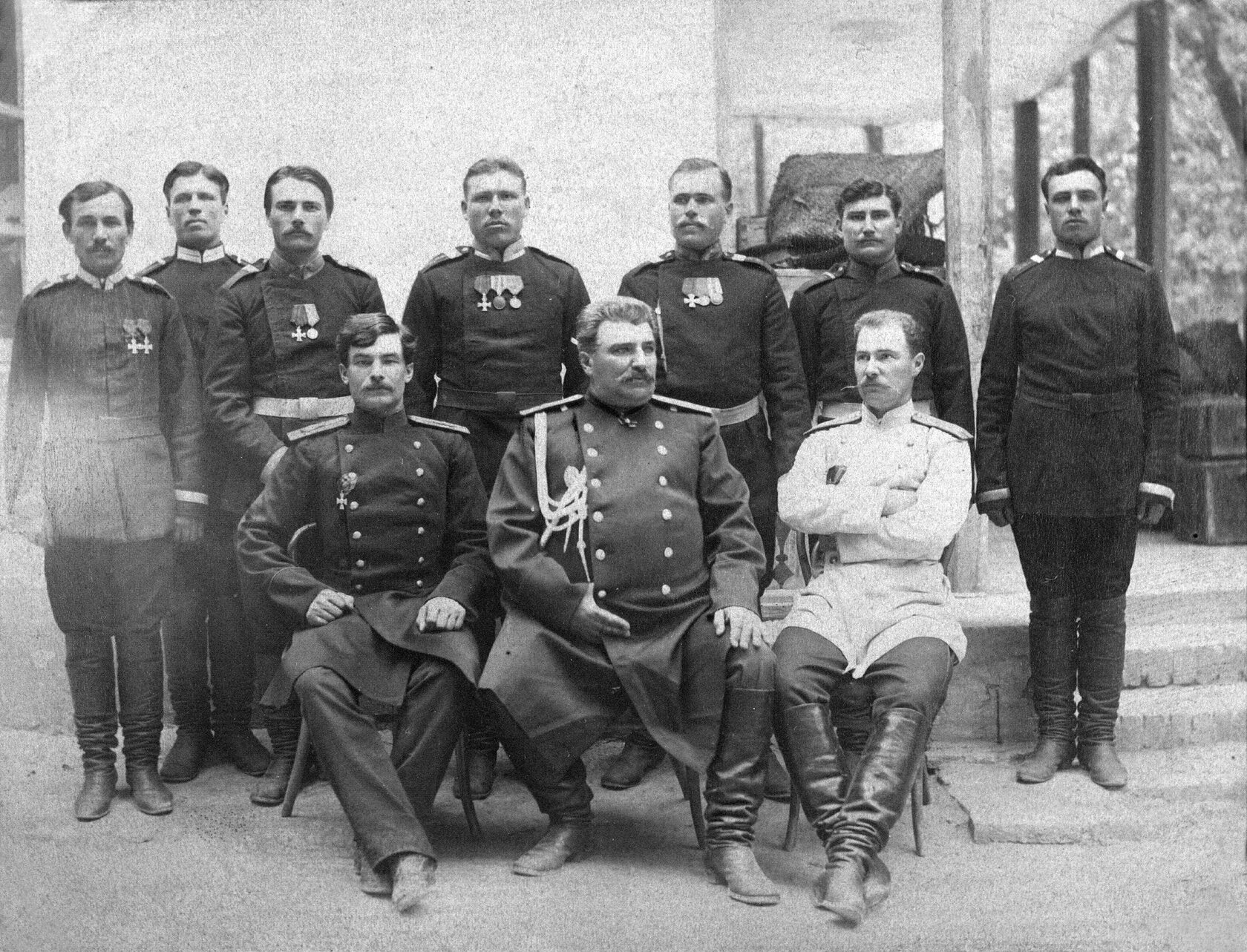 Участники Второй Тибетской экспедиции Пржевальского 1883 — 1885 гг. Пётр Козлов сидит первый слева. Фото: Научный архив РГО